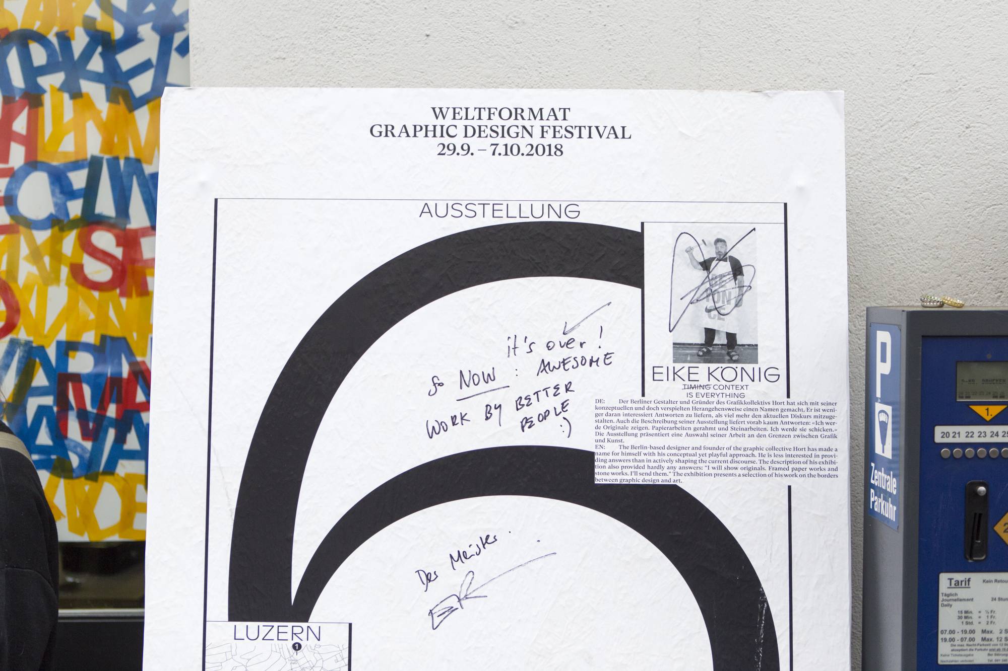 Der Gestalter des diesjährigen Festivalplakats, Ludovic Balland, hat zudem eine Ausstellung für das Weltformat Graphic Design Festival konzipiert. Diese war keine Retrospektive seiner bisherigen Arbeit – der Gestalter präsentierte stattdessen eine Soundinstallation, welche sein Projekt Poster-Talks auf ganz besondere Art und Weise erlebbar machte; die Satzfetzen, die er für das Festivalplakat zitierte, wurden den BesucherInnen vorgelesen.