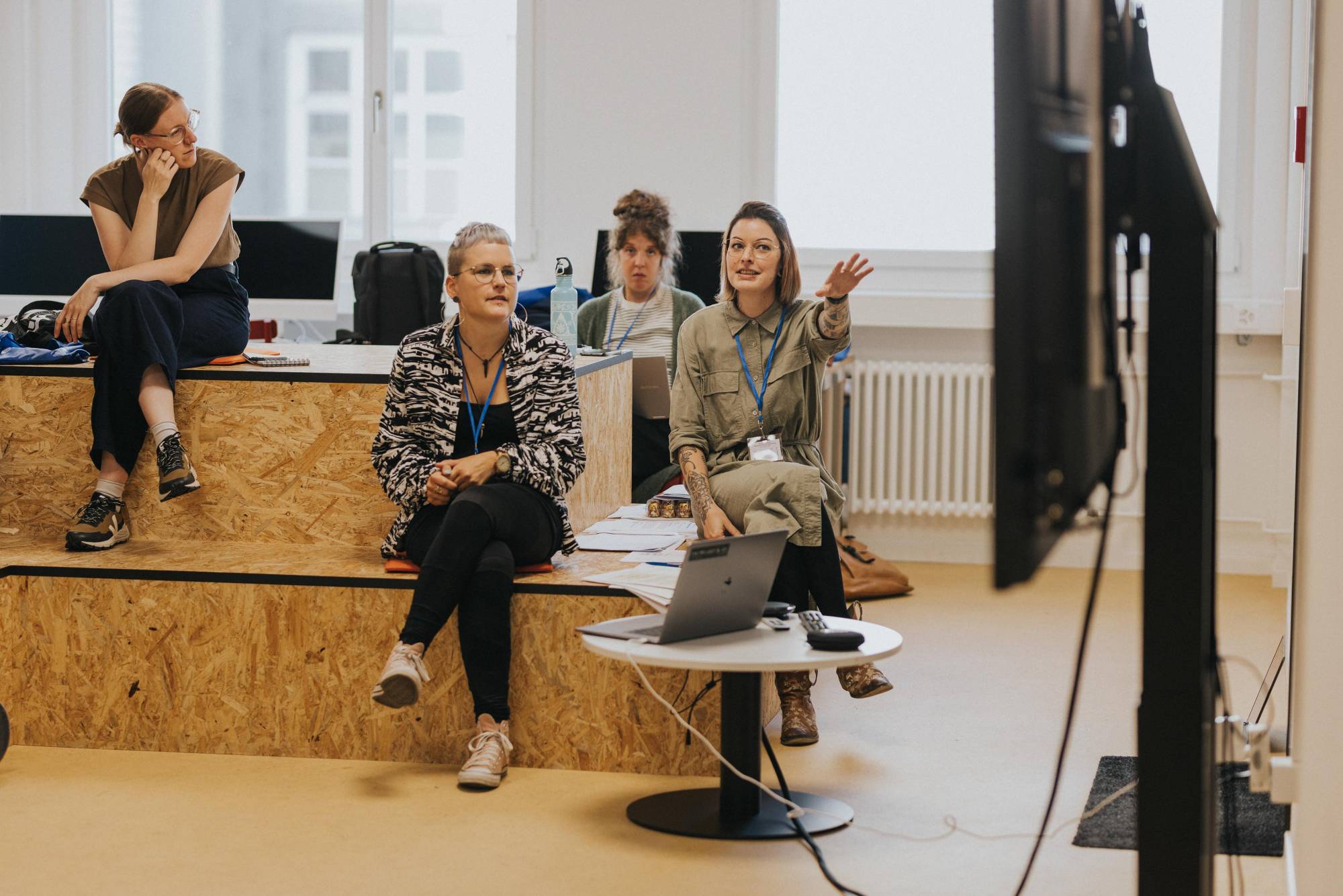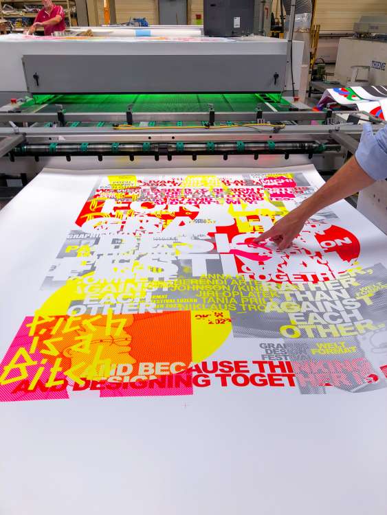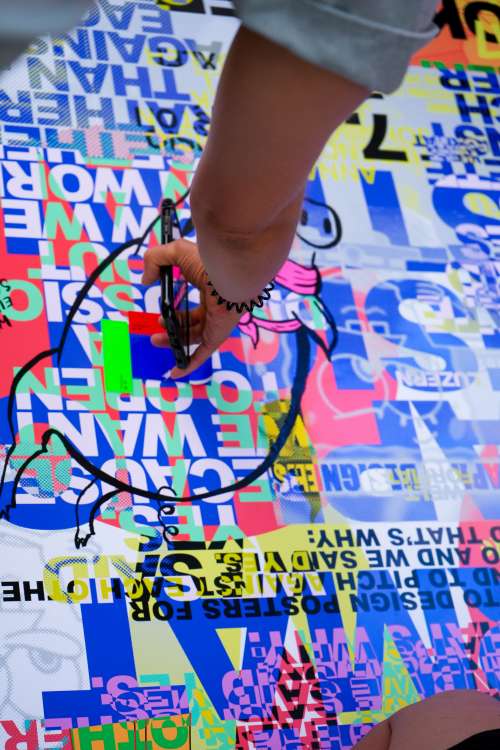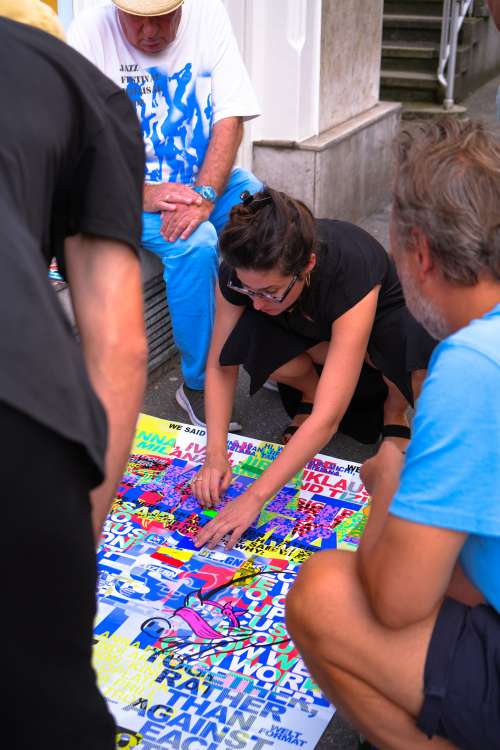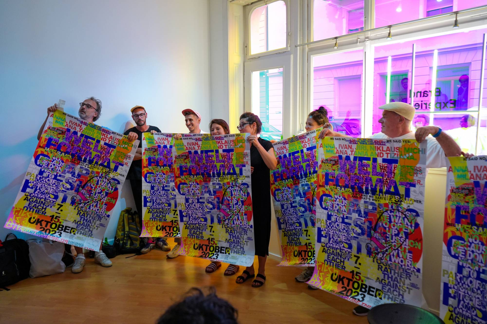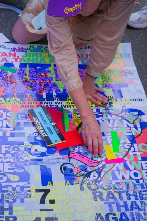 Passend zum diesjährigen Thema luden wir die sieben angesehenen Gestalter:innen Anna Haas (Fribourg),Herendi Artemisio (Zürich), Johnson/Kingston (Bern/Luzern), Jiri Oplatek (Claudiabasel, Basel), Tania Prill (Zürich) und Niklaus Troxler (Willisau) ein, unser offizielles Festivalplakat zu gestalten und gemeinsam als Jury das Gewinnerplakat auszuwählen. Doch während der Jurierung überraschte ihre Protestaktion nachhaltig. Die Gestalter:innen nutzten die Bühne der Plakatpräsentation des Wettbewerbs als Plattform, um gegen ausbeuterische Pitchkultur Einspruch zu erheben. Gemeinsam betraten die Gestalter:innen die Bühne und enthüllten das Plakat, an dem sie in Zusammenarbeit gearbeitet hatten. Durch ihren gestalterisch geprägten Protest setzten sie sich aktiv für Zusammenarbeit, Solidarität und einen dialogorientierten Ansatz ein, um Vermittlung zwischen den Anwesenden und innerhalb der Szene zu fördern. Ihre Proklamation: «We were asked to design a poster for the Weltformat Festival and pitch against each other. We said no and we said yes. And thats why: We said no, because we dont want to partivipate in unpaid pitches and compete against each other. We said yes, because we want to open up a discussion about how we an work together, rather than against each other. And because thinking and working together is great fun. Pitch is a bitch». Unser aufrichtiger Dank gilt ihrem Mut und ihrem gemeinsamen Einsatz für unsere Szene.