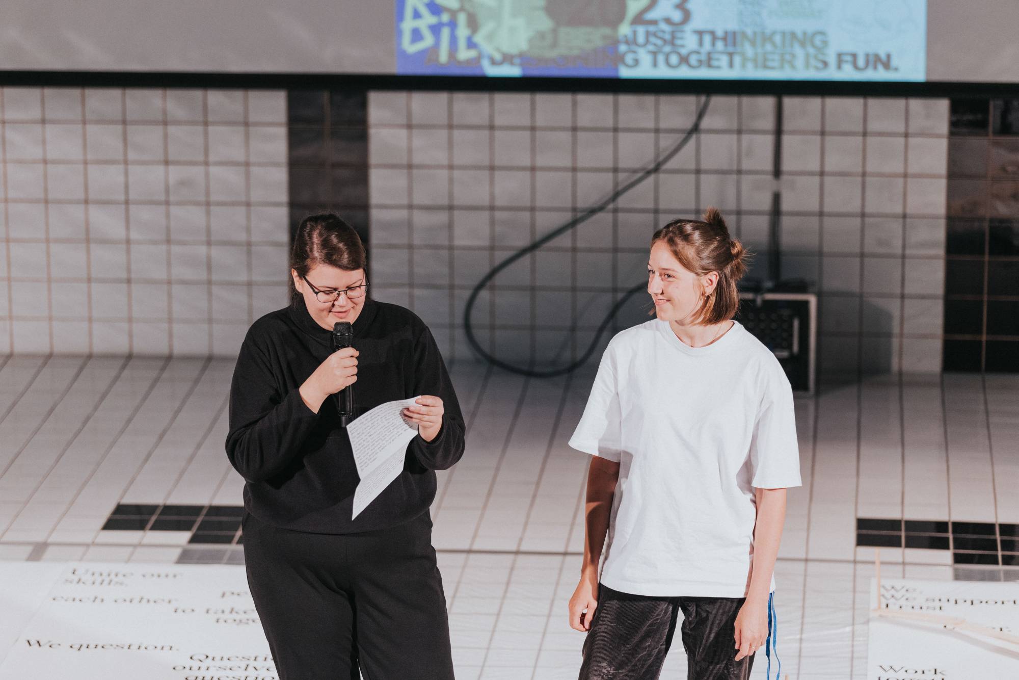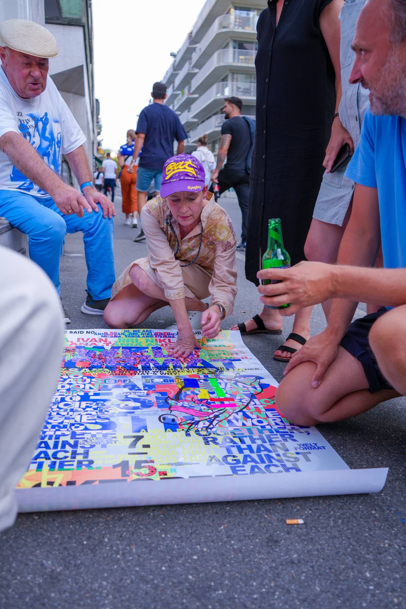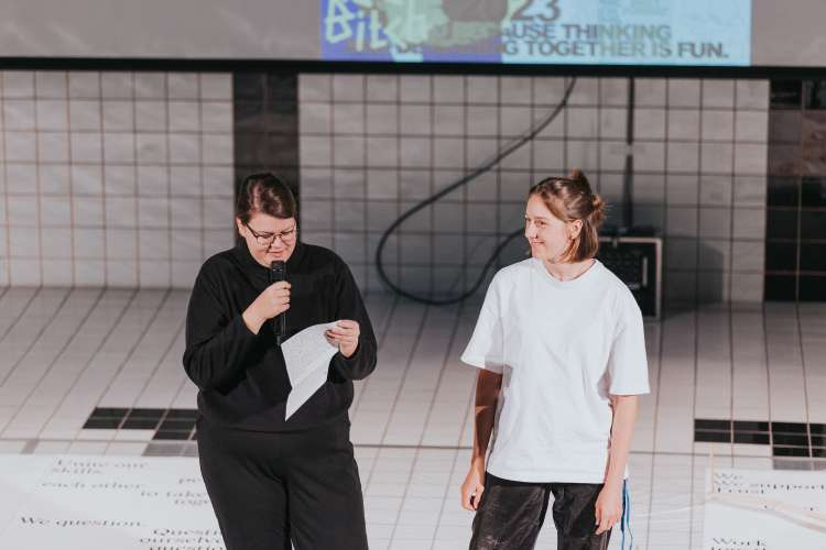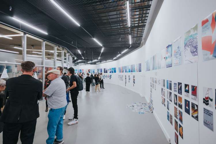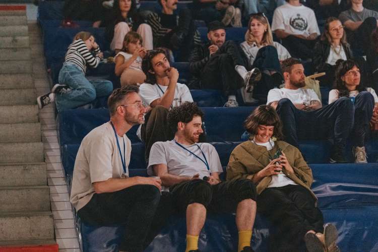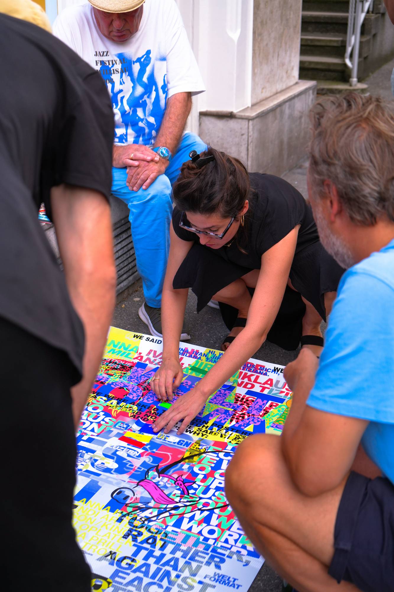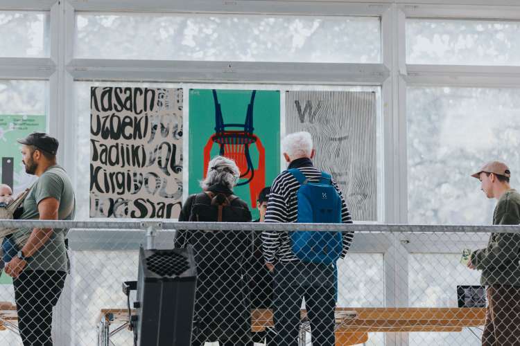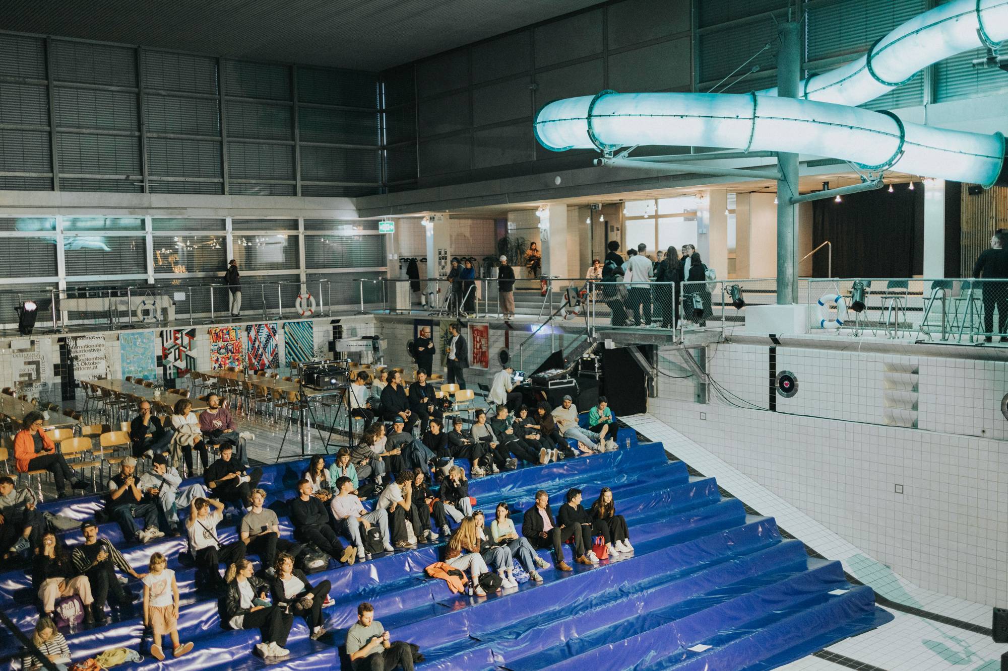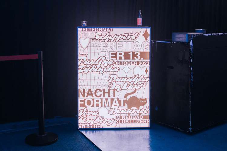 Das Eröffnungsevent im Neubad Pool nach dem Eröffnungstag liess den Abend nochmals richtig ausklingen. Während des Festivalessens bot sich allen Besuchenden die Gelegenheit zur Interaktion, zum Knüpfen neuer Kontakte sowie zum Wiedersehen nach einer langen Zeit. Das vielseitige Rahmenprogramm bot eine Fülle an Unterhaltungsmöglichkeiten, darunter die Typotombola, bei der Gäste Fragen beantworteten, um sich die Möglichkeit auf Preise wie zum Beispiel das aktuelle Festivalmerchandise zu sichern. Zudem gab es eine kleine Ausstellung aller Weltformat-Plakate als Jubiläumsspecial. Das Team von Studio Kollygujer förderte mit seinem selbst entwickelten Tool-Projekt namens «Me, We, Us» die Zusammenarbeit der Gestalter:innen. Am Ende des Abends resultierte daraus eine Ausstellung mit 8 Plakaten.