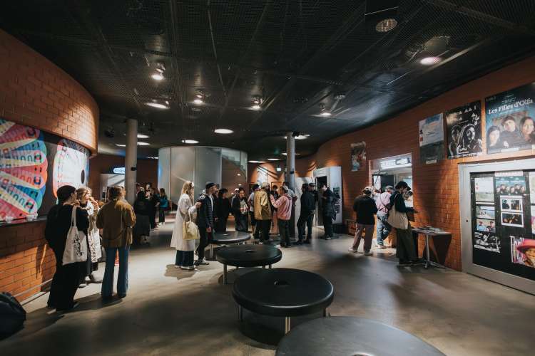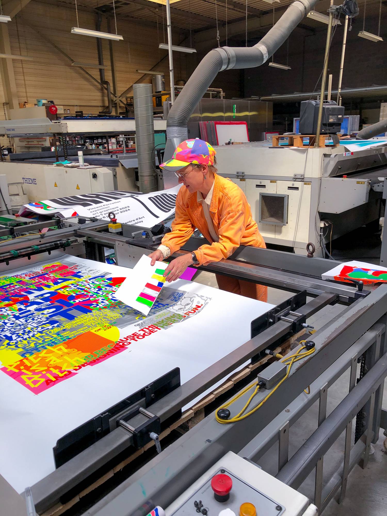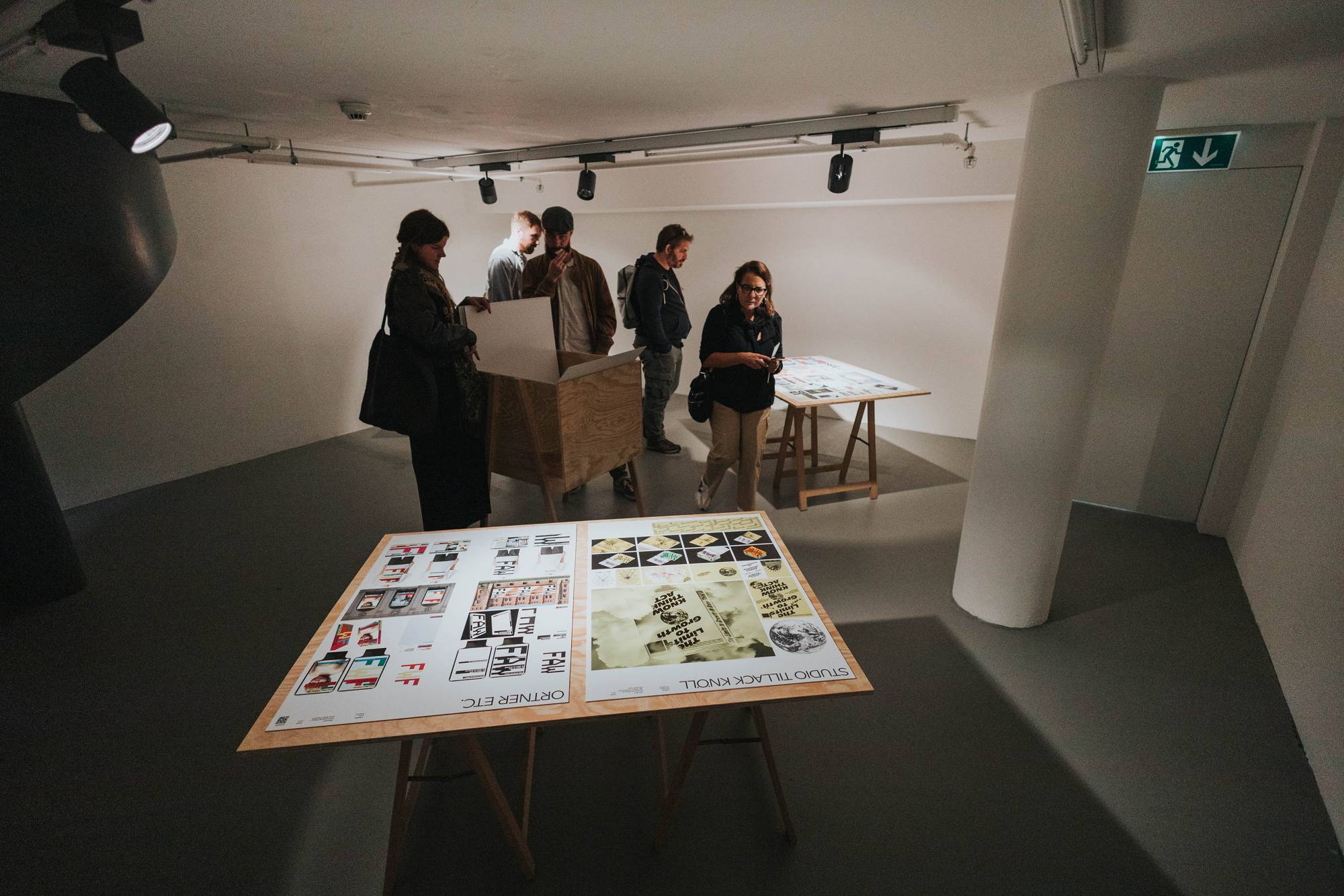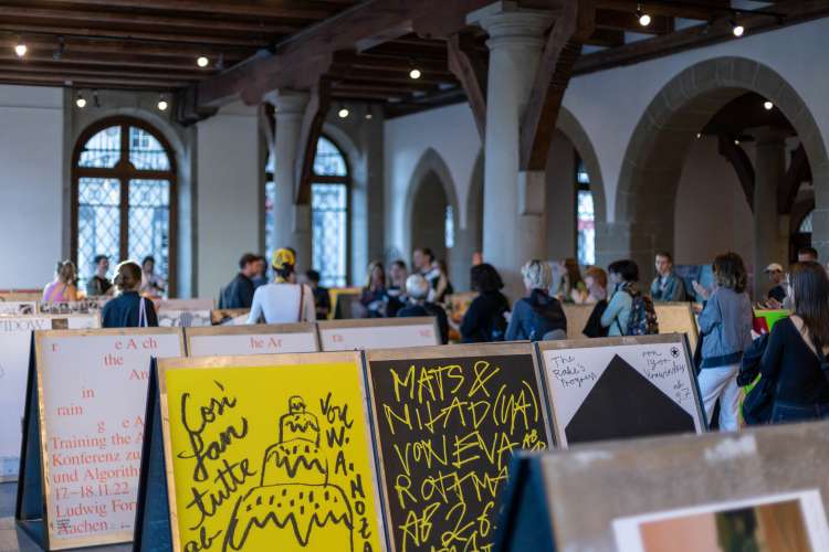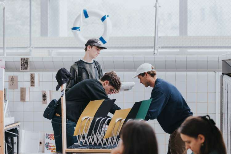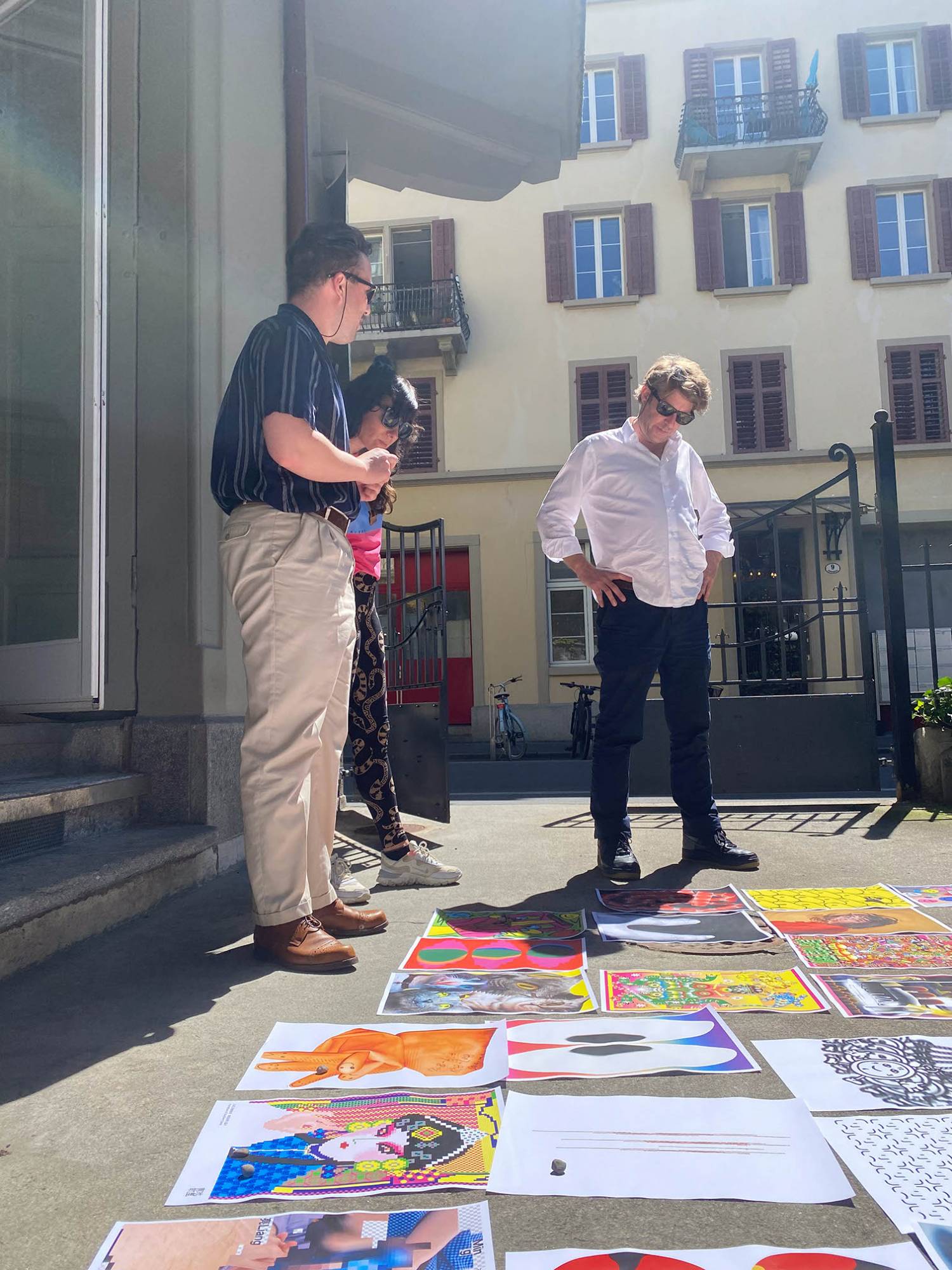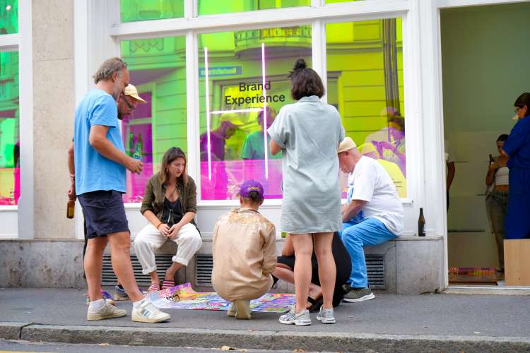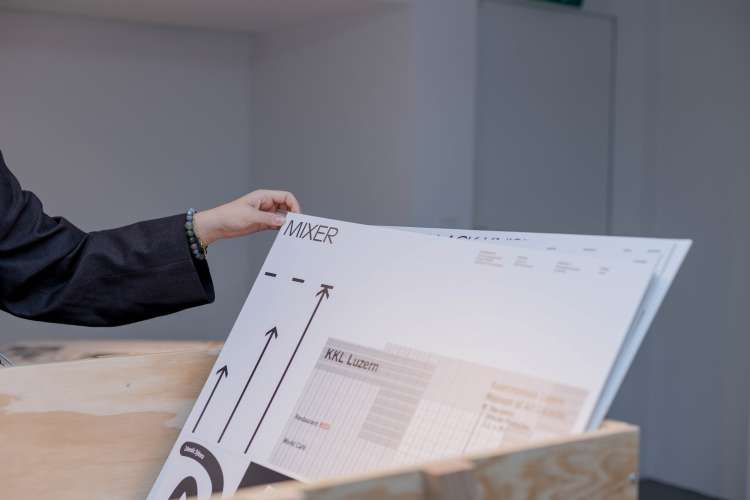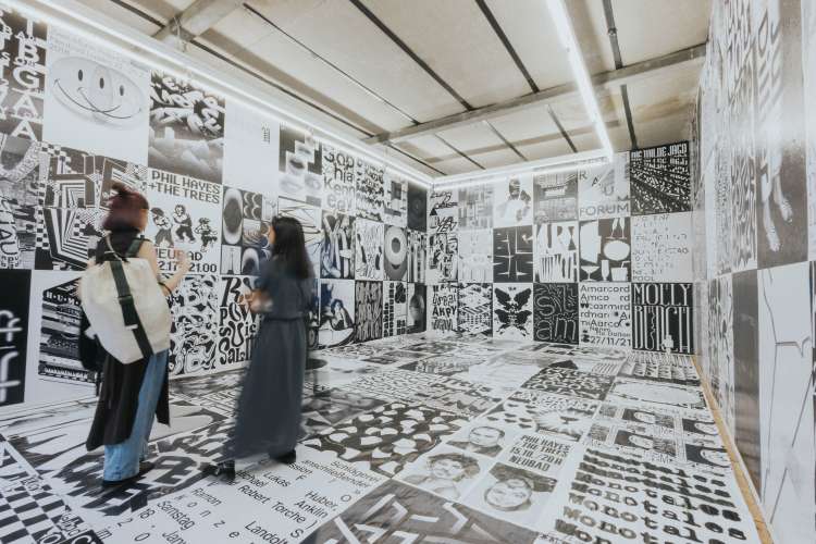 Das Eröffnungsevent im Neubad Pool nach dem Eröffnungstag liess den Abend nochmals richtig ausklingen. Während des Festivalessens bot sich allen Besuchenden die Gelegenheit zur Interaktion, zum Knüpfen neuer Kontakte sowie zum Wiedersehen nach einer langen Zeit. Das vielseitige Rahmenprogramm bot eine Fülle an Unterhaltungsmöglichkeiten, darunter die Typotombola, bei der Gäste Fragen beantworteten, um sich die Möglichkeit auf Preise wie zum Beispiel das aktuelle Festivalmerchandise zu sichern. Zudem gab es eine kleine Ausstellung aller Weltformat-Plakate als Jubiläumsspecial. Das Team von Studio Kollygujer förderte mit seinem selbst entwickelten Tool-Projekt namens «Me, We, Us» die Zusammenarbeit der Gestalter:innen. Am Ende des Abends resultierte daraus eine Ausstellung mit 8 Plakaten.