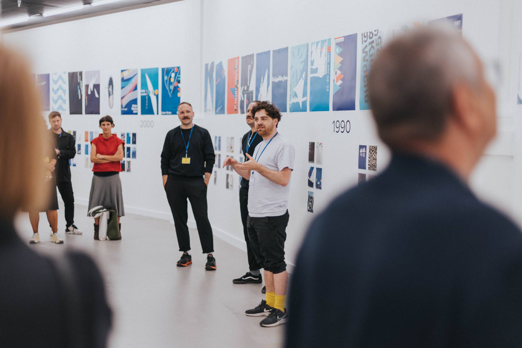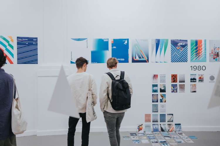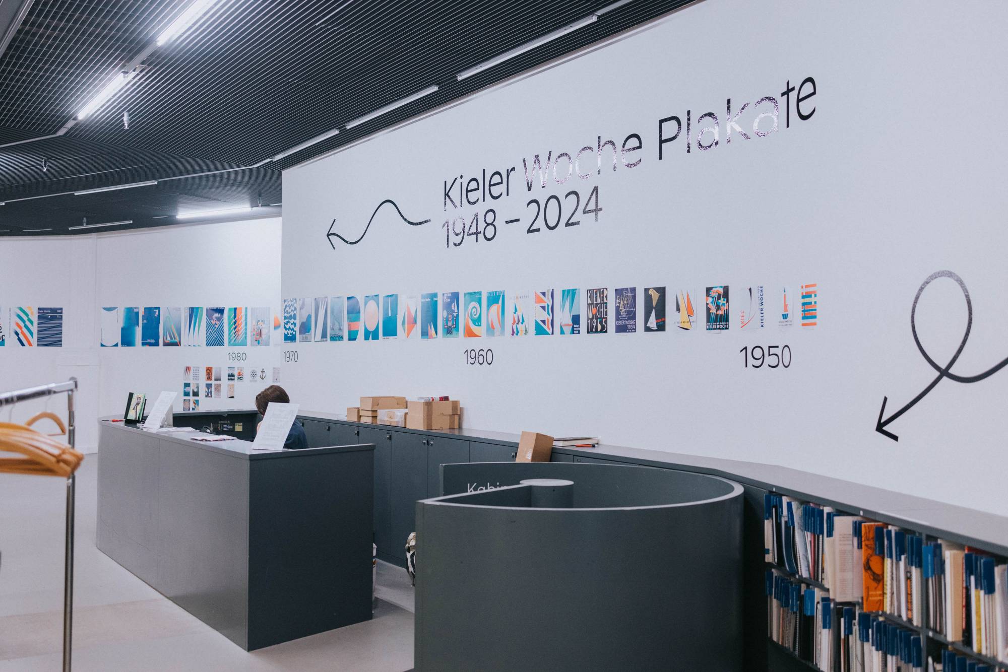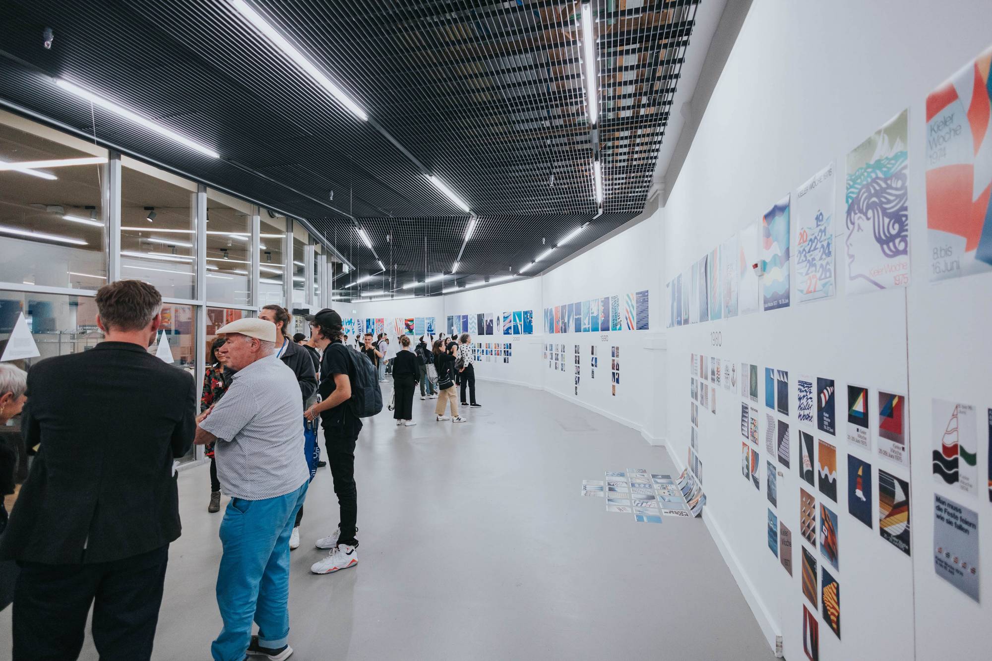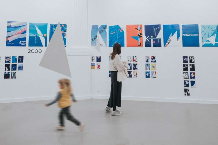 Die Kieler Woche ist nicht nur Europas grösste Segelregatta, sondern auch ein riesiges Stadtfest, das Menschen aus ganz Deutschland anlockt. Im Laufe der Jahre hat sich diese jährliche Veranstaltung zu einem angesehenen Designwettbewerb entwickelt: Seit 1959 werden jedes Jahr fünf auserwählte Gestalter:innen oder Designbüros eingeladen, im Rahmen eines Pitches das Plakat für die folgende Veranstaltung zu gestalten. Dabei erhalten sie nicht nur ein schriftliches Briefing, sondern werden auch für ein Wochenende zur Kieler Woche eingeladen, um alles vor Ort und aus erster Hand zu erleben. Das Thema des Plakats bleibt über die Jahre hinweg unverändert, und so bieten die Entwürfe der letzten sechzig Jahre einen einzigartigen Einblick in die Entwicklung der europäischen Grafik. In unserer Ausstellung präsentierten wir erstmals nicht nur alle Siegerentwürfe, sondern auch eine breite Auswahl an Entwürfen der teilnehmenden Teams. So wurden 400 Plakate in der Kunsthalle ausgestellt. Die Liste der Gewinner und Teilnehmer liest sich wie ein Whoʼs Who des Grafikdesigns. Prominente Namen wie Anton Stankowski, Ruedi Baur, Wim Crouwel, Cyan, Alan Fletcher, Josef Müller-Brockmann und Rosmarie Tissi sind darunter zu finden. 2x Goldstein (Karlsruhe) führte uns in die von Josh Schaub kuratierte Ausstellung mit ihrem Wissen ein und eröffnete die Ausstellung.