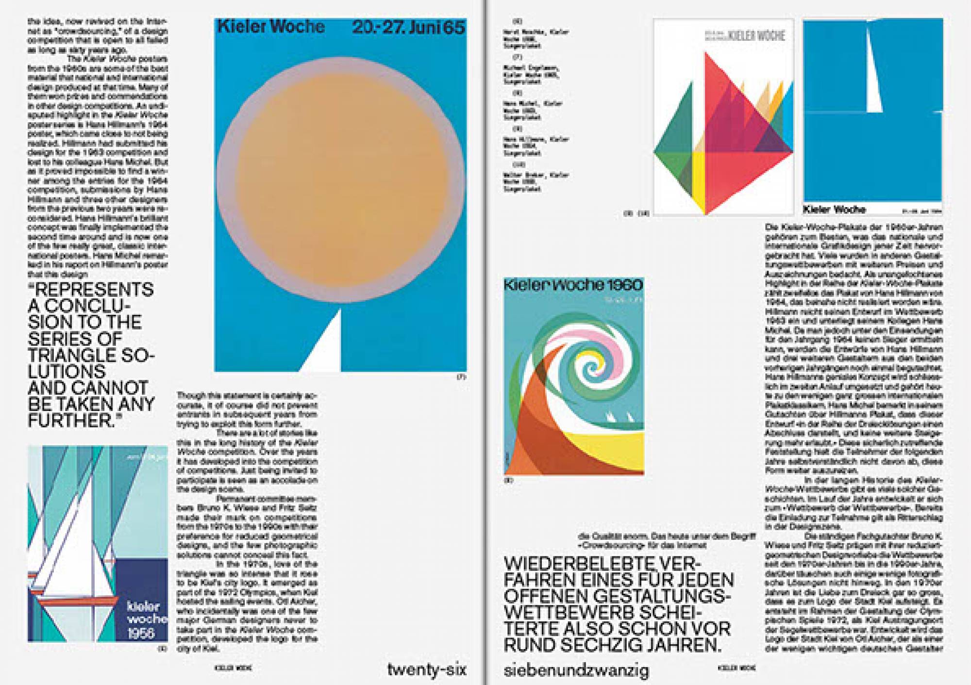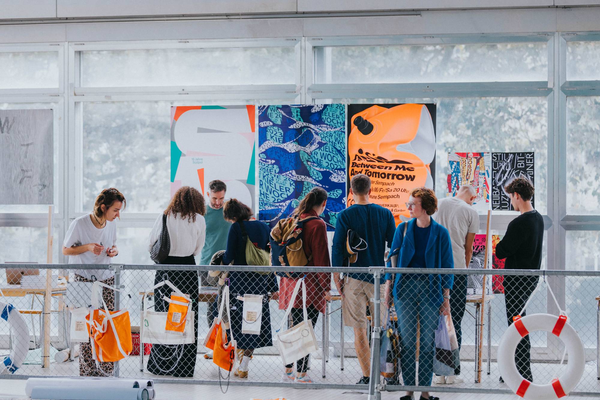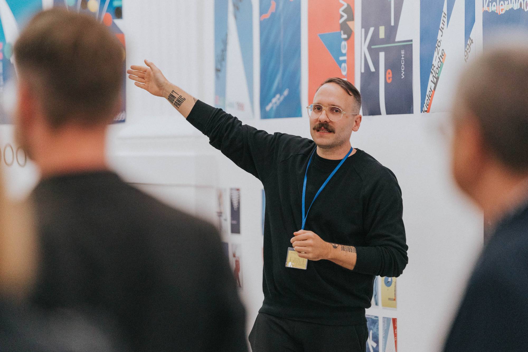 Die Kieler Woche ist nicht nur Europas grösste Segelregatta, sondern auch ein riesiges Stadtfest, das Menschen aus ganz Deutschland anlockt. Im Laufe der Jahre hat sich diese jährliche Veranstaltung zu einem angesehenen Designwettbewerb entwickelt: Seit 1959 werden jedes Jahr fünf auserwählte Gestalter:innen oder Designbüros eingeladen, im Rahmen eines Pitches das Plakat für die folgende Veranstaltung zu gestalten. Dabei erhalten sie nicht nur ein schriftliches Briefing, sondern werden auch für ein Wochenende zur Kieler Woche eingeladen, um alles vor Ort und aus erster Hand zu erleben. Das Thema des Plakats bleibt über die Jahre hinweg unverändert, und so bieten die Entwürfe der letzten sechzig Jahre einen einzigartigen Einblick in die Entwicklung der europäischen Grafik. In unserer Ausstellung präsentierten wir erstmals nicht nur alle Siegerentwürfe, sondern auch eine breite Auswahl an Entwürfen der teilnehmenden Teams. So wurden 400 Plakate in der Kunsthalle ausgestellt. Die Liste der Gewinner und Teilnehmer liest sich wie ein Whoʼs Who des Grafikdesigns. Prominente Namen wie Anton Stankowski, Ruedi Baur, Wim Crouwel, Cyan, Alan Fletcher, Josef Müller-Brockmann und Rosmarie Tissi sind darunter zu finden. 2x Goldstein (Karlsruhe) führte uns in die von Josh Schaub kuratierte Ausstellung mit ihrem Wissen ein und eröffnete die Ausstellung.
